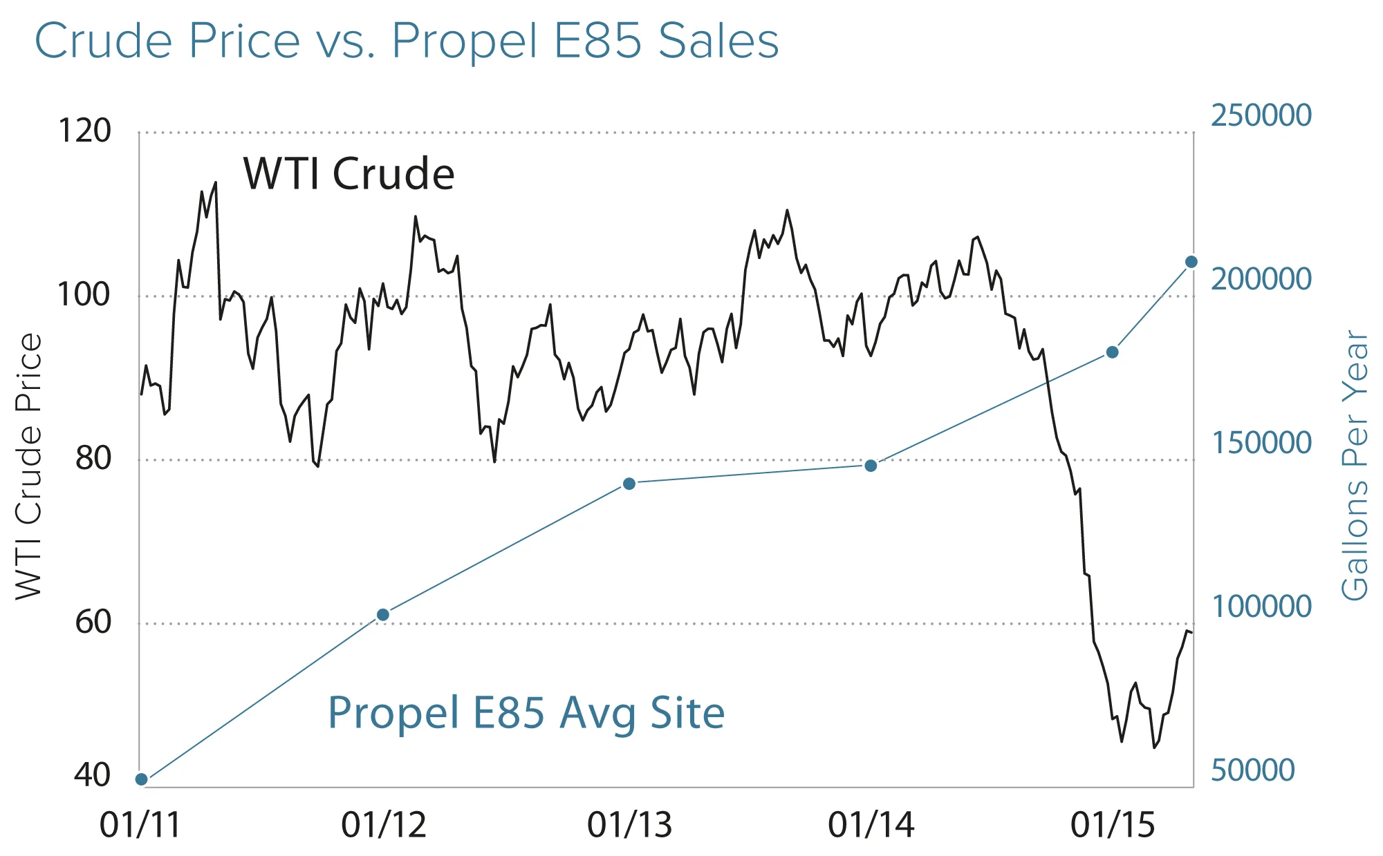 Propel's retail strategies are the primary driver of California’s E85 market growth since 2009, resulting in 70% market share. Propel's unique market approach has outperformed the California average retail location by 300% and increased E85 volumes despite petroleum pricing volatility.